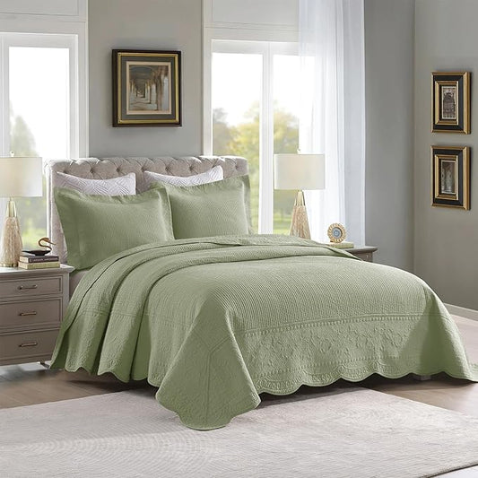 MarCielo 3-Piece 100% Cotton Oversized Bedspread Lightweight Quilt Coverlet Embroidery Farmhouse Bedding Set (TG Pale Green, Oversized King (118"x106"))