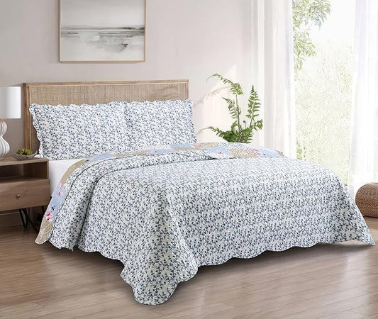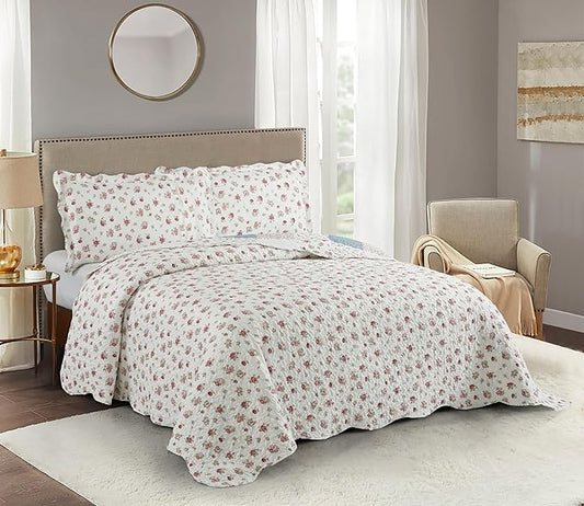 MarCielo 3-Piece 100% Cotton Oversized Bedspread Lightweight Quilt Coverlet Embroidery Farmhouse Bedding Set(TL Floral White,Oversized Queen (100"x106"))