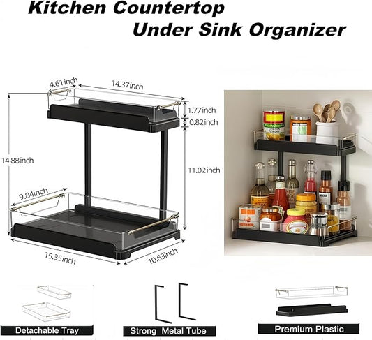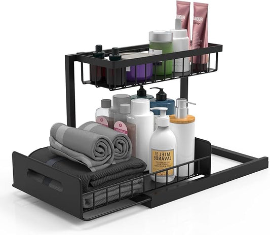 Under Sink Organizer with Pull-Out Drawers,Kitchen Sink Organizer,2 Tier Bathroom Organizers And Storage,Bathroom Accessories Set,Black 1 Pack
