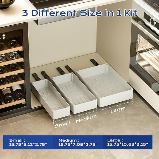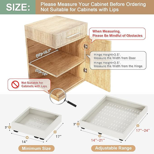 2Pc Pull out Cabinet Organizer,Width (14"-21"),Depth(17"-24") Expandable with 3 Rails,No Drill Roll out Drawers,Adhesive Sliding Drawers,Slide out Shelves for Cabinets Without Lip,Kitchen,Pantry,White