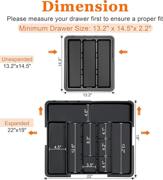 Large Utensil Drawer Organizer Expandable Silverware Organizer for Kitchen Drawer Adjustable Cooking Utensil Holder Cutlery Flatware Tray Spatula Tools Gadgets Storage Dividers Plastic Black