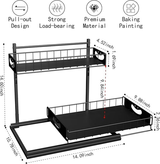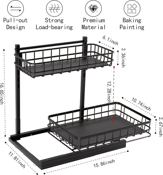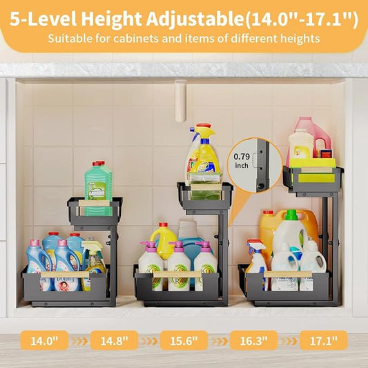 Under Sink Organizer, Adjustable Height Pull-Out Kitchen Storage Organization,15.8" x 11.8" x 16.5",2-Tier Kitchen Shelf,Bathroom Drawer Organizer, Black