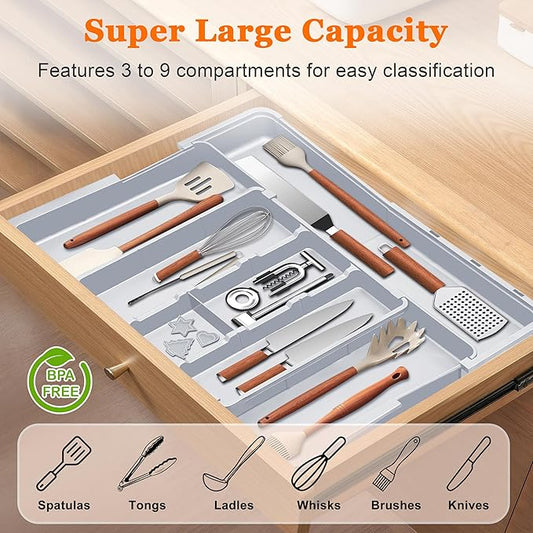 Large Utensil Drawer Organizer Expandable Silverware Organizer for Kitchen Drawer Adjustable Cooking Utensil Holder Cutlery Flatware Tray Spatula Tools Gadgets Storage Dividers Plastic Grey