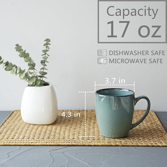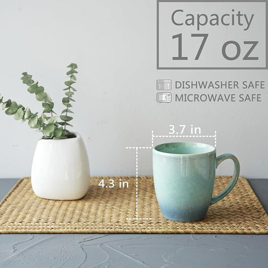 Bosmarlin Ceramic Coffee Mug Set of 4, 17 Oz, Coffee Cups with Big Handle, Microwave Safe, Unique Reactive Glaze (Lake Green, 17 Oz)