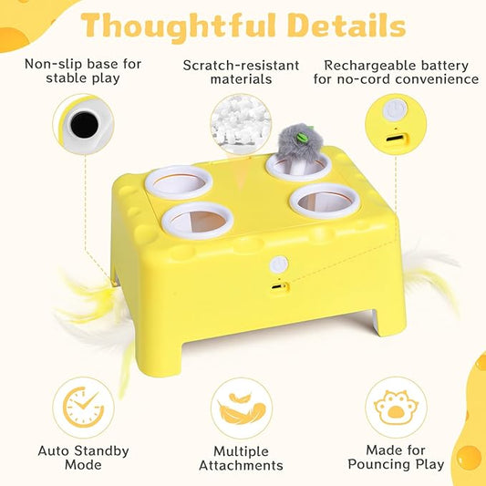 Interactive Cat Toy for Indoor Cats, 3 Modes Feathers Toy, Rechargeable 4 Holes Mole Cat Toys, Cheese Box for Kitten, 4 Accessories (Yellow)