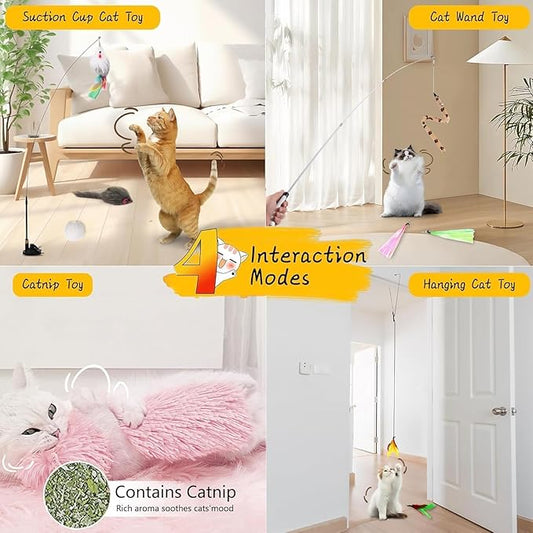 4-in-1 Interactive Cat Feather Toys with Durable Retractable Fishing Pole, 11 Attachments Replacements and Interactive Cat Toys for Indoor Cats