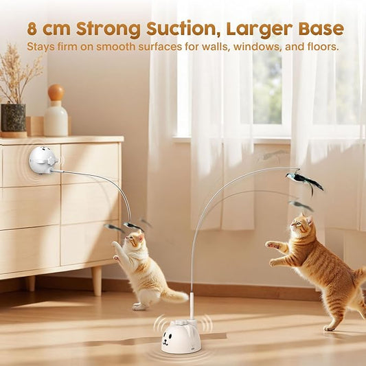 Interactive Cat Toys for Indoor Cats: Upgraded 360° Automatic Spin Flying Bird Feather Wand with Silicone Protected Rod Safe Play, Strong 8cm Suction Cup, USB-Rechargeable for Bored Kittens and Adult