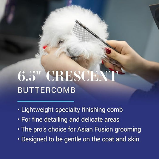 Chris Christensen 00C 6.5 in Crescent Coarse/Fine Finishing Butter Comb, Groom Like a Professional, Rounded Corners Prevent Friction and Breakage, Solid Brass Spin with Steel Teeth, Chrome Finish