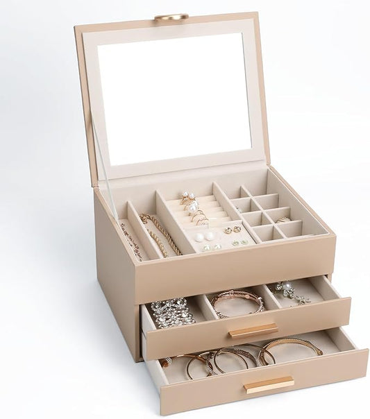 Leather Jewelry Box Premium 3-Layer Jewelry Case with Mirror - Scratch-Resistant Storage for Earrings, Rings, Necklaces, Ideal Gift for Women Apricot