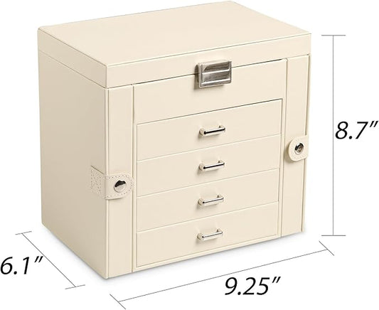 Frebeauty 5-layer Jewelry Box,Faux Leather Jewelry Organizer with 4 Drawers,Jewelry Organizers and Storage with Mirror,Jewelry Holder Organizer for Necklace,Jewerly Boxes for Women Girls(Beige)