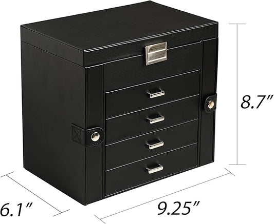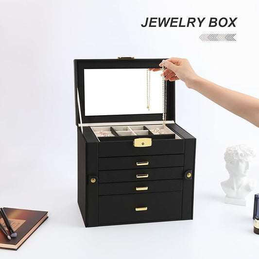 Frebeauty 5-layer Jewelry Box,Faux Leather Jewelry Organizer with 4 Drawers,Jewelry Organizers and Storage with Mirror,Jewelry Holder Organizer for Necklace,Jewerly Boxers for Women Girls(Black)