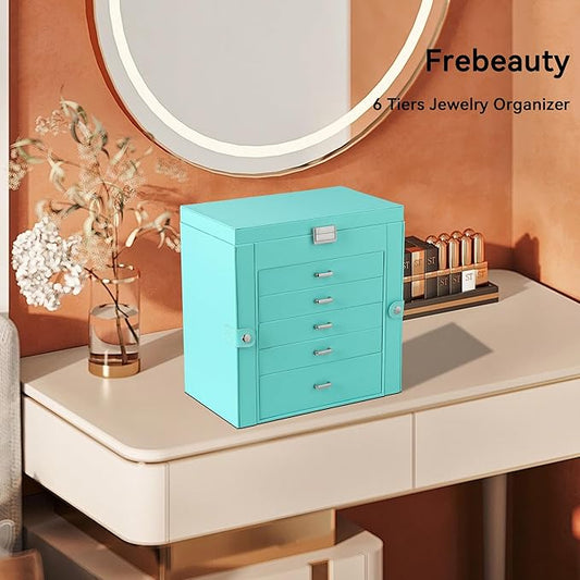 Frebeauty Large Jewelry Box,6-Tier PU Leather Jewelry Organizer,Multi-functional Storage Case with Mirror,Accessories Holder with 5 Drawers for Necklace Bracelets Watches(Turquoise)