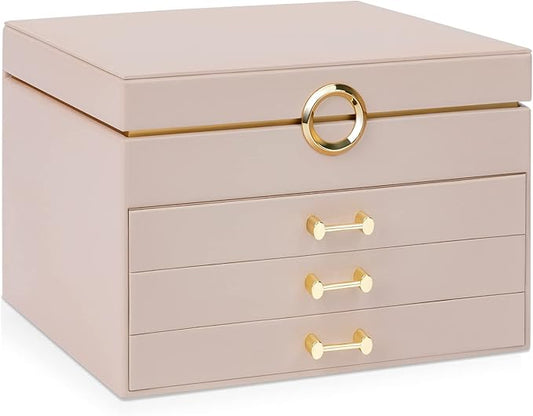 Jewelry Boxes for Women, Large Jewelry Storage Boxes, 4-Layer Leather Jewelry Organizer with 3 Drawers, Jewelry Display Case Gift for Women Girls, Apricot