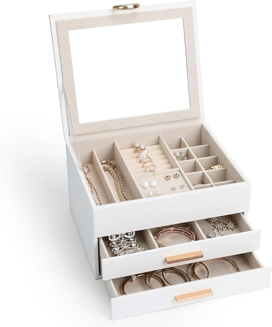 Elegant Jewelry Storage Box with Mirror 3-Tier Design with Smooth-Gliding Drawers Jewelry Organizer Perfect Christmas Birthday Gift for Wife Mom Women White