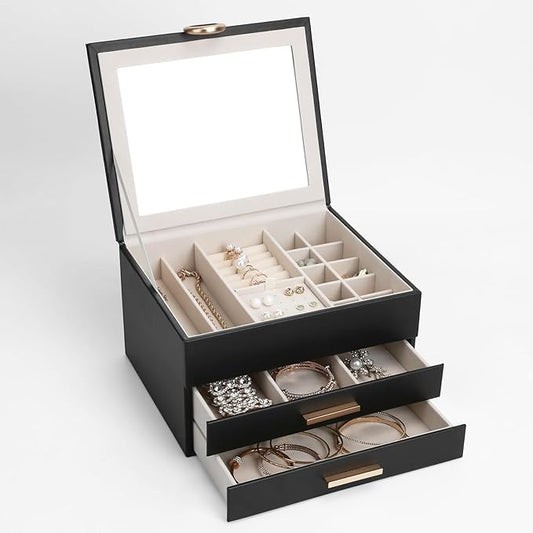 Jewelry Boxes for Women, Large Jewelry Storage Boxes, 4-Layer Leather Jewelry Organizer with 3 Drawers, Jewelry Display Case Gift for Women Girls, Black