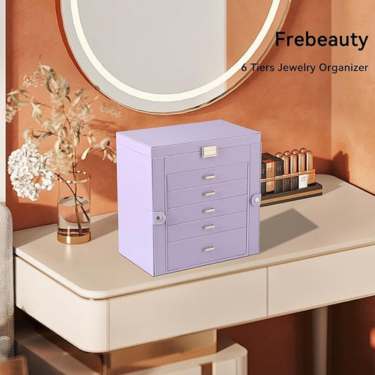Frebeauty Large Jewelry Box,6-Tier PU Leather Jewelry Organizer,Multi-functional Storage Case with Mirror,Accessories Holder with 5 Drawers for Necklace Bracelets Watches(Purple)