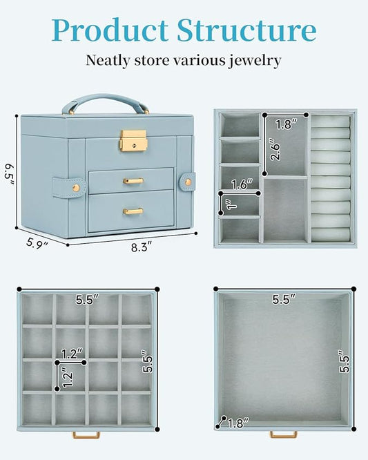 TORIBIO Large Jewelry Box for Women, Leather Jewelry Organizer with Mirror & Lock, 6-Tier Jewelry Storage Case for Girls/Women/Mothers, Necklace Earring Bracelets Holder Organizer, Grey Blue
