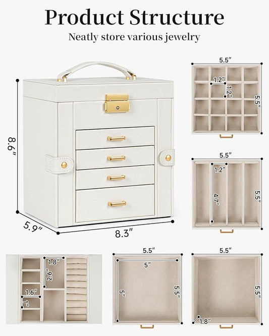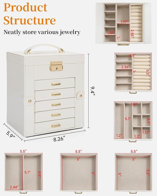 TORIBIO Jewelry Box for Women, Leather Jewelry Organizer with Mirror & Lock, 5-Tier Jewelry Storage Organizer with 4 Drawers for Girls/Women/Mothers, Necklace Earring Bracelets Holder Organizer