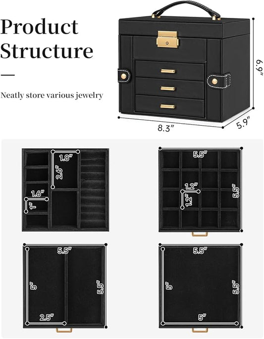 TORIBIO Jewelry Box for Women, Leather Jewelry Organizer with Mirror & Lock, 4-Tier Jewelry Storage Organizer with 3 Drawers for Girls/Women/Mothers, Necklace Earring Bracelets Holder Organizer