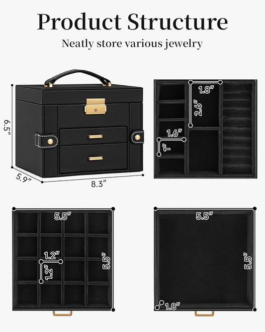 2 Layer Jewelry Box, Jewelry Organizer For Woman, Men & Girls Large Case 8.5x7.5x3.3in | PU Leather Jewelry Gift Storage Boxes For Ring, Necklace & Bracelet With Lock (Black)