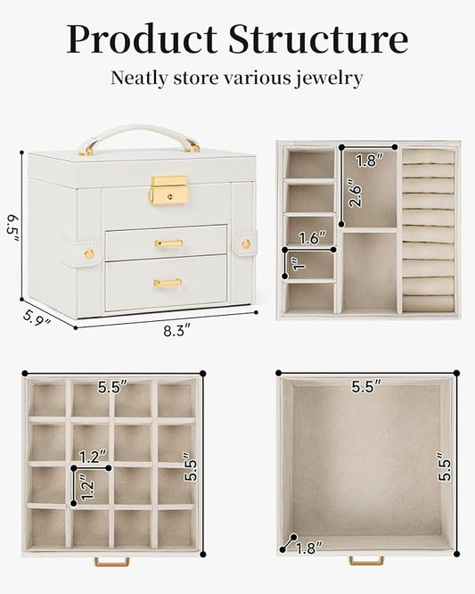 TORIBIO Jewelry Box for Women, Leather Jewelry Organizer with Mirror & Lock, 3-Tier Jewelry Storage Organizer with 2 Drawers for Girls/Women/Mothers, Necklace Earring Bracelets Holder Organizer
