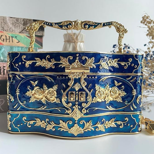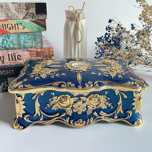 Truewon Jewelry Chest Rose Pastoral Style Metal Box Trinket Vintage Trinket Gemstone Storage Tray Treasure Souvenir Gift Case for Girls Women (Golden Blue, Extra Large)