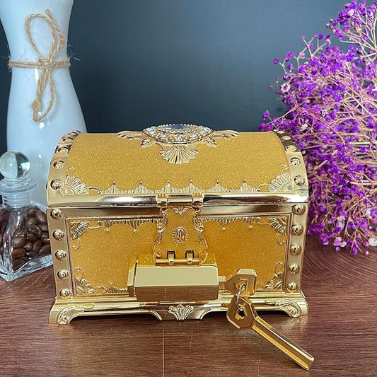 Retro Jewelry Box Arched Vintage Rectangular Metal Chest Necklace Ring Earrings Storage Case for Women Girls (Golden Starlight Yellow, L Lock)