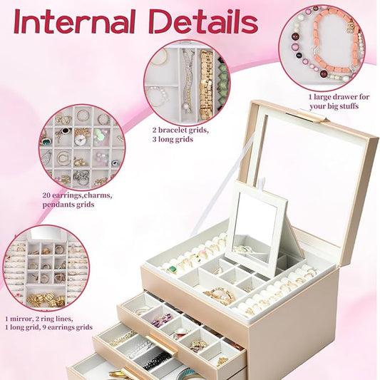 BOOVO Clear Lid Jewelry Box,4 Layers Jewelry Organizer Large Jewelry Storage Box with 3 Drawers,Jewelry Holder Organzier of Rings Earrings Necklace Bracelets for Women (Champagne, 4 Layer)