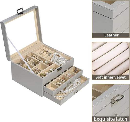 BOOVO Clear Lid Jewelry Box,3 Layers Jewelry Organizer Large Multi-Functional Jewelry Storage Box with 2 Drawers,Jewelry Display Case of Rings Earrings Necklace Bracelets for Women Girls (Grey)