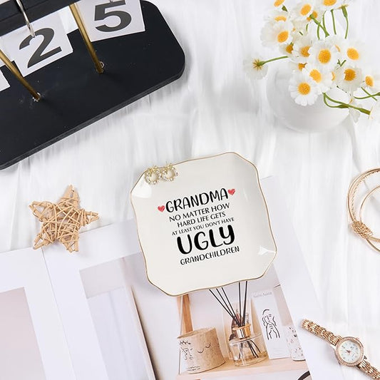Grandma Gifts Jewelry Dish Ring Tray, Grandmother Birthday Gifts for Grandma Christmas Valentines Mother's Day Gift from Grandkids-No Matter How Hard Life...You Don't Have Ugly Grandchildren
