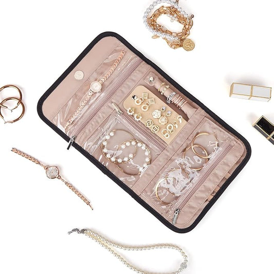 BELALIFE Travel Jewelry Case Organizer, Small Foldable Storage Roll for Earrings, Necklaces, Rings, Bracelets, Brooches, Black
