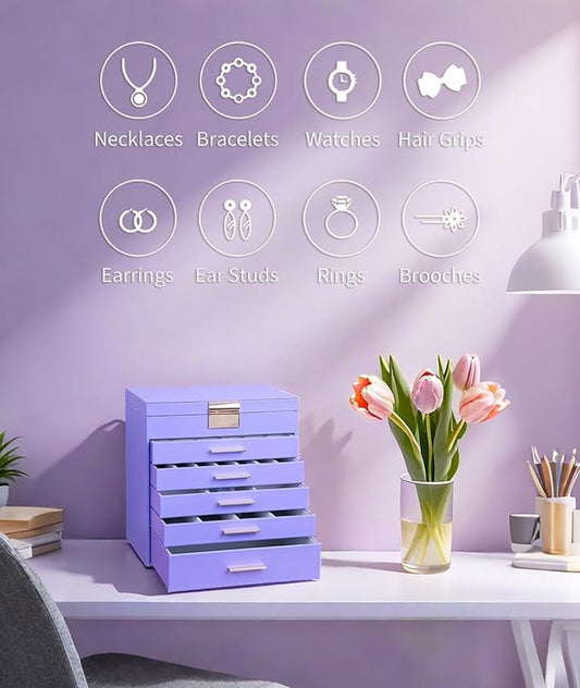 BOOVO Jewelry Box with Necklace Hanger – 6 layer Jewelry Organizer for Women with 5 Drawers, Large Jewelry Storage Boxes –Jewelry Organizers and Storage for Earrings, Necklaces (Purple, 6 layer)