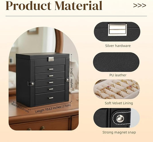 BOOVO Jewelry Box For women, 6 Layer Large Jewelry Organizer With Mirror, Multi-Function Storage Box With Lock, Accessory Holder With 5 Drawers, For Earrings Necklace Ring Bracelet (Black)