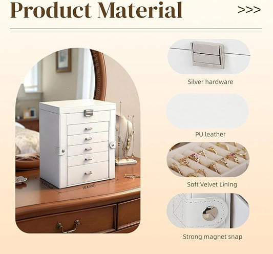 BOOVO Jewelry Box For women, 6 Layer Large Jewelry Organizer With Mirror, Multi-Function Storage Box With Lock, Accessory Holder With 5 Drawers, For Earrings Necklace Ring Bracelet (White)