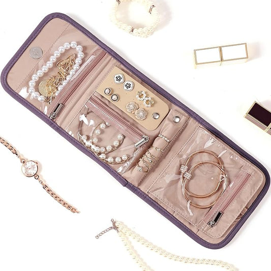 BELALIFE Travel Jewelry Case Organizer, Small Foldable Storage Roll for Earrings, Necklaces, Rings, Bracelets, Brooches, Purple