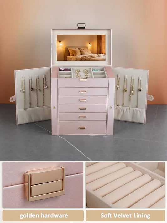 BOOVO Jewelry Box with Necklace Hanger – 6 layer Jewelry Organizer for Women with 5 Drawers, Large Jewelry Storage Boxes –Jewelry Organizers and Storage for Earrings, Necklaces (Pink, 6 layer)