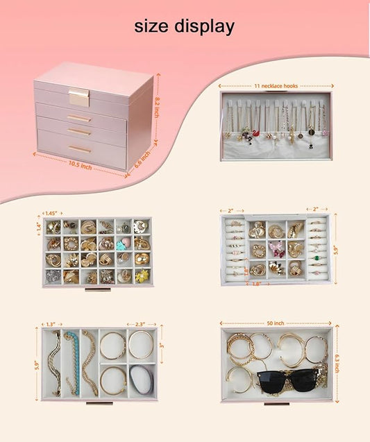 pickpiff Jewelry Box Organizer Case for Women: 4-Layer Jewelry Storage Case with Glass Window, Pink Leather with Velvet Holder for Ring Necklace Bracelet Brooch Watch, Great Gift for Her