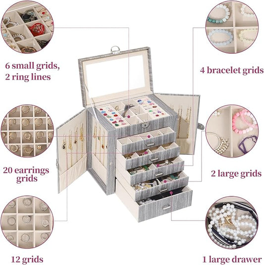BOOVO Jewelry Box For women, 6 Layer Large Jewelry Organizer With Mirror, Accessory Holder With 5 Drawers, For Earrings Necklace Ring Bracelet (woodgrain grey)