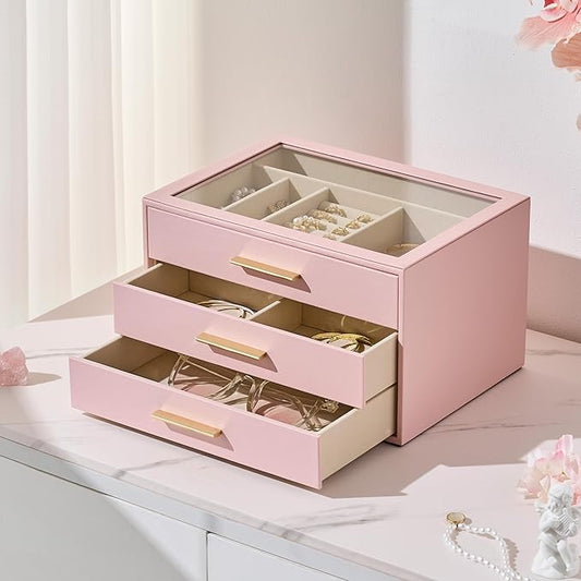 pickpiff Jewelry Box Organizer Case for Women: 3-Layer Jewelry Storage Case with Glass Window, Pink Leather with Velvet Holder for Ring Necklace Bracelet Brooch Watch, Great Gift for Her