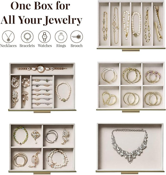 Jewelry Box Organizer Case for Women: 5-Layer Jewelry Storage Case with Glass Window, Olive Green Leather with Cream Velvet, Holder for Ring Necklace Bracelet Brooch Watch, Great Gift for Her