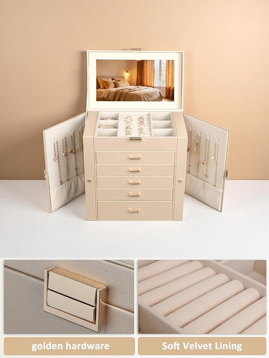 BOOVO Jewelry Box For women, 6 Layer Large Jewelry Organizer With Mirror, Multi-Function Storage Box With Lock, Necklace Holder With 5 Drawers, For Earrings Necklace Bracelet (Champagne Gold)