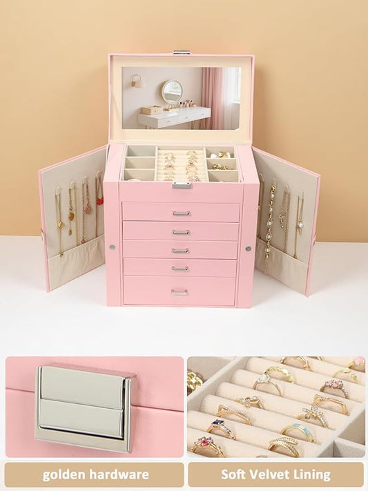 BOOVO Jewelry Box For women, 6 Layer Large Jewelry Organizer With Mirror, Multi-Function Storage Box With Lock, Necklace Holder With 5 Drawers, For Earrings Necklace Bracelet (Silver and Pink)