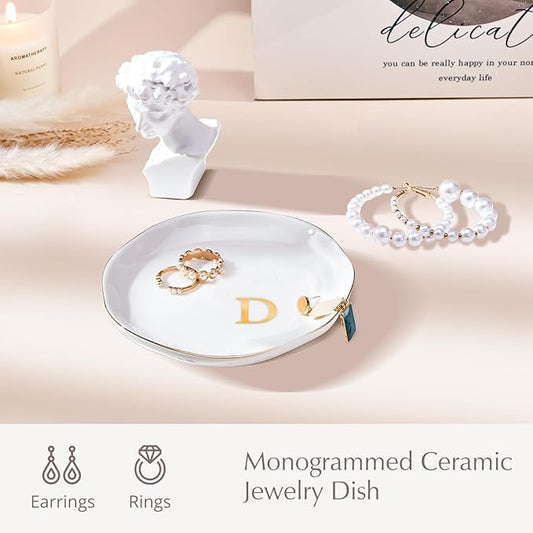 ProCase Ceramic Jewelry Tray, Initial Ring Dish Trinket Plate Engagement Gift, Small Personalized Monogram Ring Bowl for Wedding, White Decorative Jewelry Holder for Women Vanity -Letter D