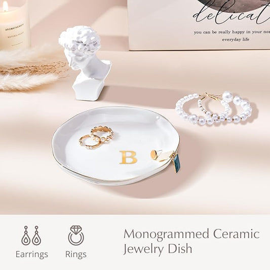 ProCase Ceramic Jewelry Tray, Initial Ring Dish Trinket Plate Engagement Gift, Small Personalized Monogram Ring Bowl for Wedding, White Decorative Jewelry Holder for Women Vanity -Letter B