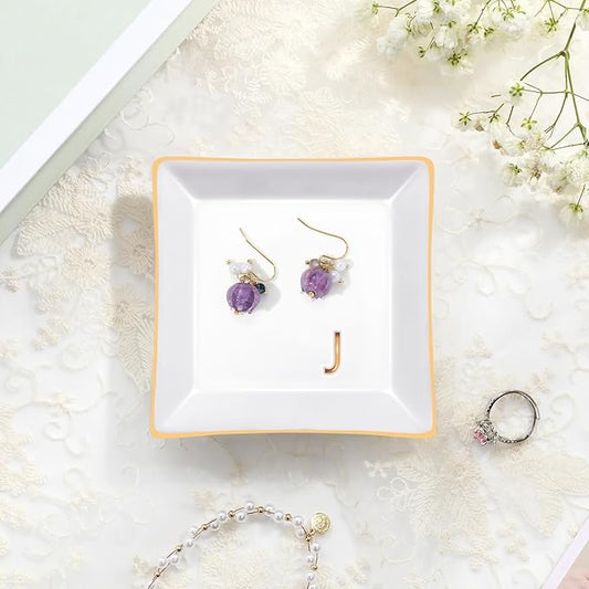 PUDDING CABIN Initial Ring Holder Jewelry Tray, Personalized J-Monogrammed Engagement Wedding Gifts for Bridesmaid, Bride, Birthday Christmas Gifts for Women, Mom, Friends, Sisters, Ceramic White