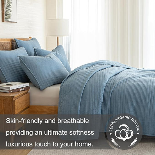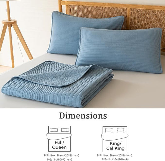100% Cotton Queen Quilt Set 3-Piece,Bedspread Set and 2 Pillowcases, Lightweight and Textured,All-Season Lightweight Queen Comforter Bedding Set(Blue)