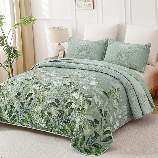 WONGS BEDDING Olive Green Quilt Set King Size,3 Pieces Botanical Leaves Printed Bedspread Coverlet Set,Microfiber Floral Bedding Set for All Season 104"x90"