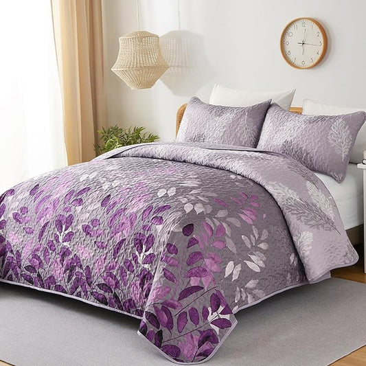 WONGS BEDDING Purple Floral Quilt Set Queen Size, 3 Pieces Botancal Leaves Bedspread Coverlet Set with 2 Pillowcases for All Season, Soft Microfiber Floral Bedding Set 96"×90"