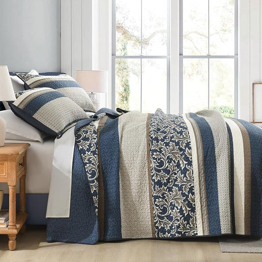 100% Cotton Quilt Set Queen Size - Striped Quilted Comforter, Patchwork Botanical Queen Quilt Bedspread, Modern Farmhouse Lightweight Bedding for Queen Bed, 3pcs, Deep Blue/Khaki/Gray
