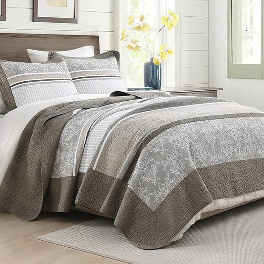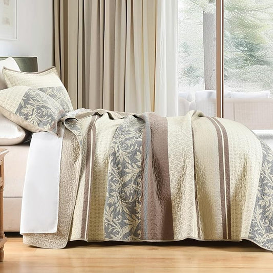 100% Cotton Quilt Set Queen Size - Reversible Quilted Comforter, Striped Botanical Queen Quilt Bedspread, Modern Lightweight Bedding for Queen Bed, 3pcs, Taupe/Gray/White